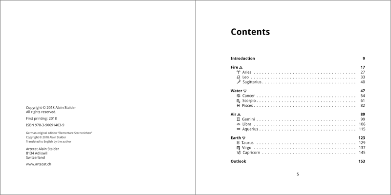 But more about that shortly, at the start of each chapter about the corresponding element and its three star signs, plus in the last chapter, Outlook, reflected from a few more angles into a short overview. The themes of the star signs are age-old. This makes it impossible to illuminate all themes from all angles, in all nuances, variations, and on all levels, in a single book. But what is realistic—besides, of course, a broad overview with many depths—, is to convey how the new tool of elementary star signs can be used to revisit and rediscover almost everything about the star signs, to find new insights and connections. If I could achieve that, it would make me very happy!