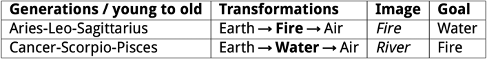 Fire transforms a fuel like wood or coal, thus something earthly (Earth), into smoke and gas (Air). The transformation of the Fire signs would thus be similar to the one of the Water signs, from Earth to Air, only here it would be Fire instead of Water, which transforms Earth to Air: